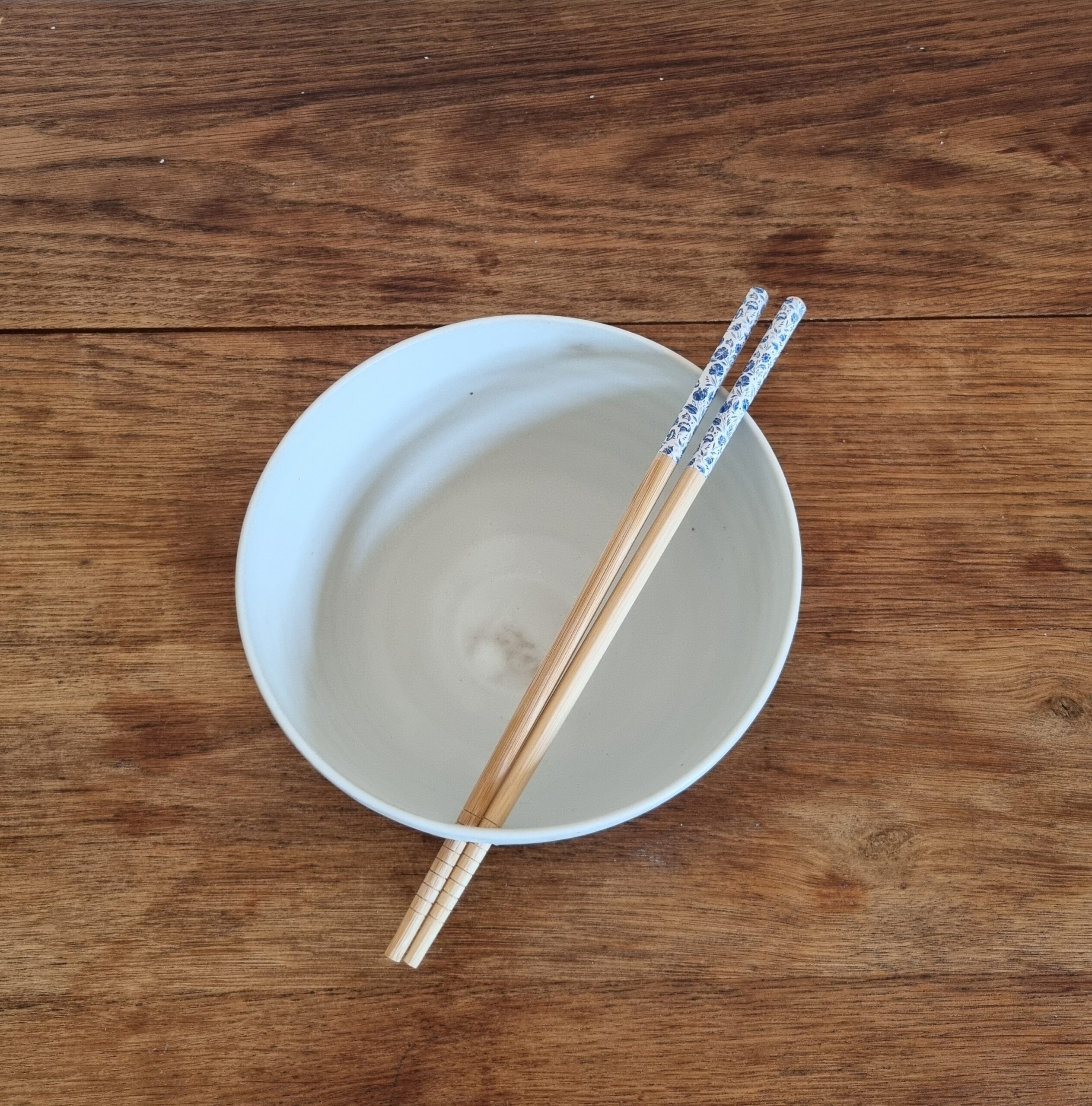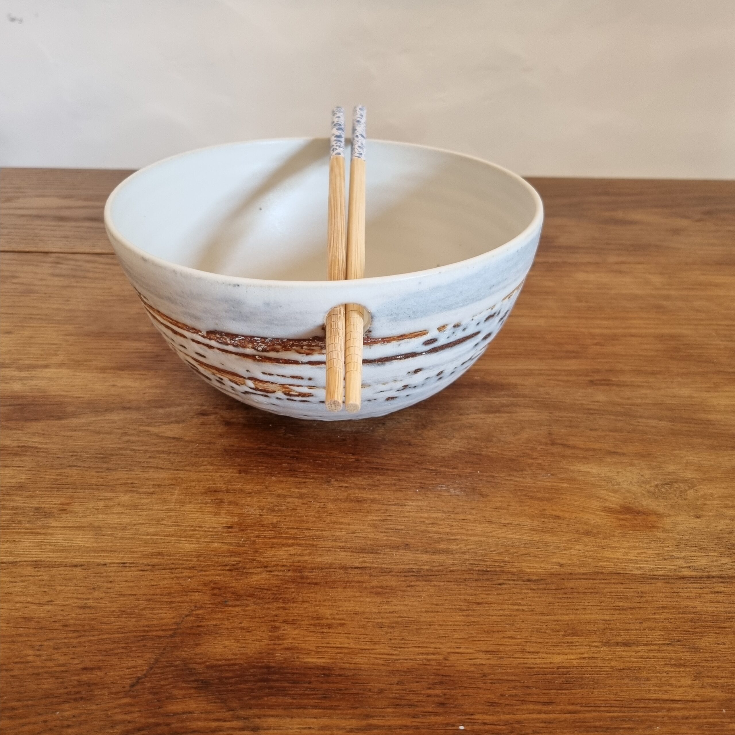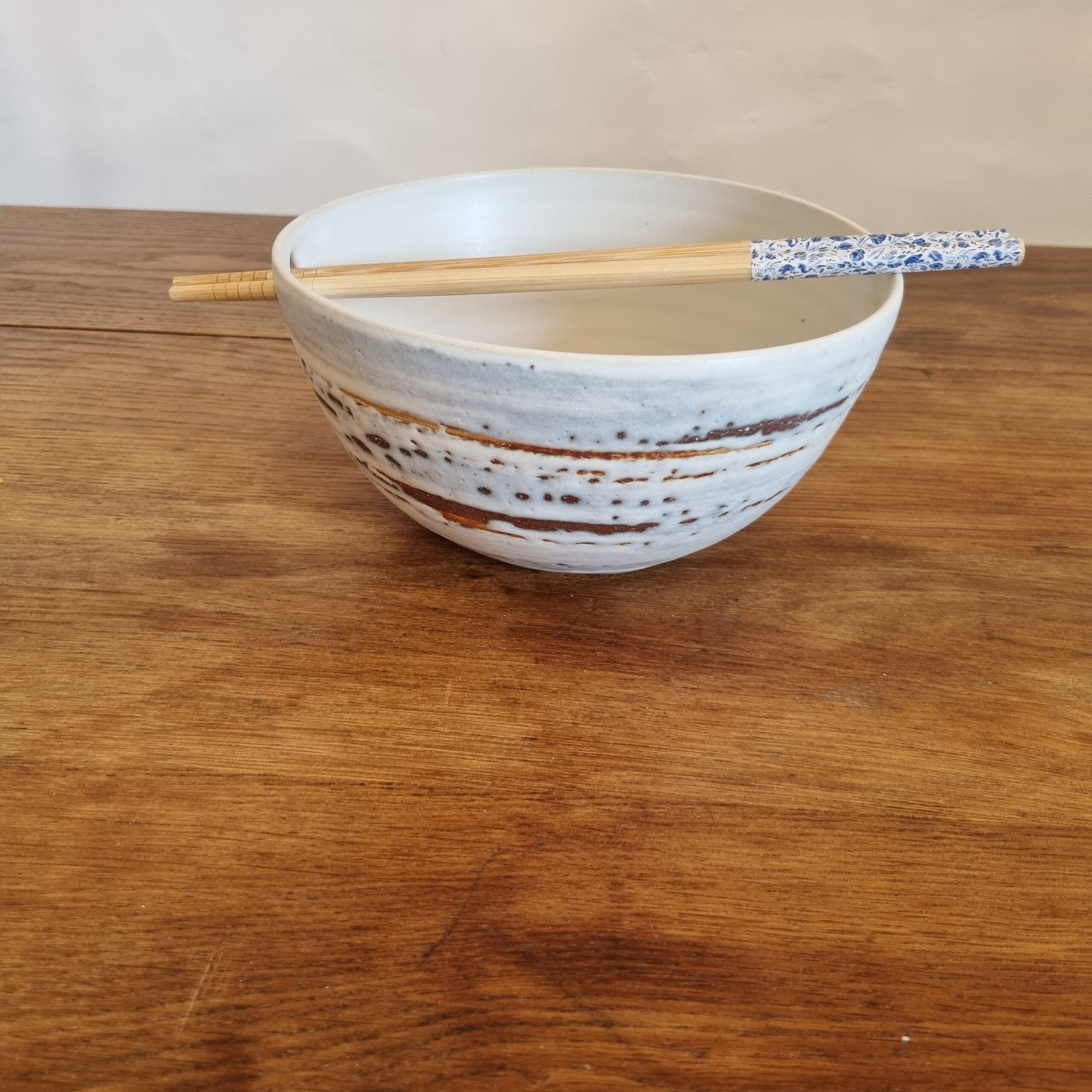 Bol à ramen artisanal accompagné de ses baguettes assorties, conçu pour transformer chaque repas en un véritable moment de plaisir. Sa forme généreuse permet d’accueillir aussi bien des bouillons riches que des plats complets, tandis que son émail unique, réalisé à partir de matières naturelles, révèle des nuances subtiles et vivantes. Chaque pièce est façonnée à la main, ce qui lui confère un caractère singulier et une présence chaleureuse à table.