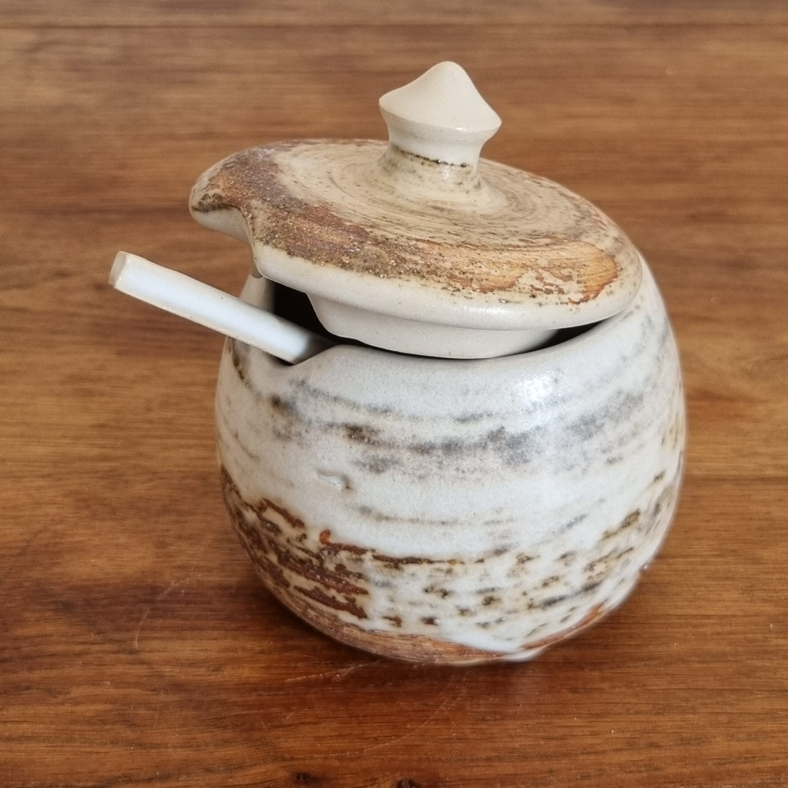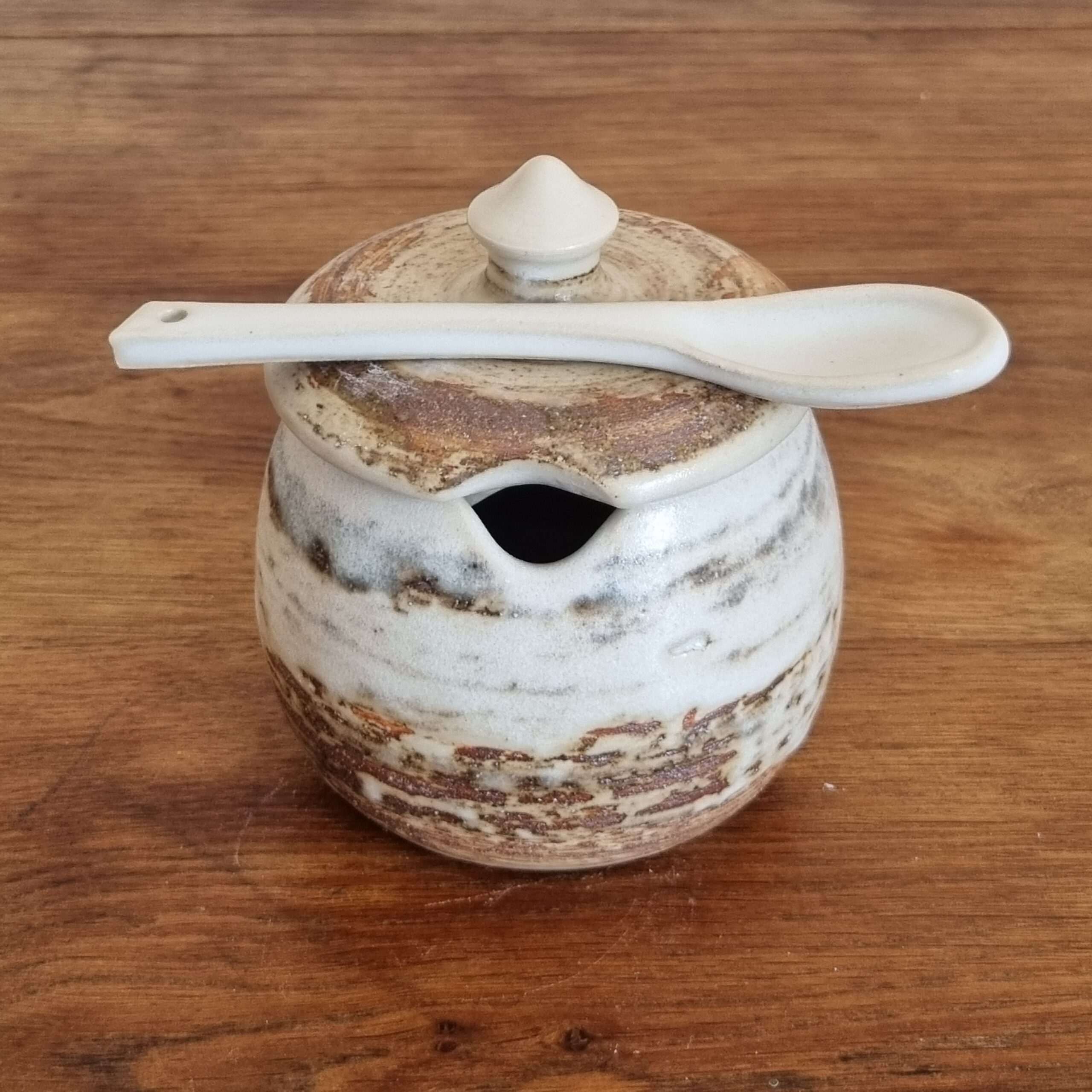 Ce petit pot en céramique, accompagné de sa cuillère assortie, est pensé pour accueillir avec élégance vos essentiels du quotidien : moutarde, confiture, sucre en poudre, miel ou encore épices. Sa forme douce et équilibrée en fait un objet à la fois pratique et décoratif, qui trouve naturellement sa place sur une table ou dans la cuisine.