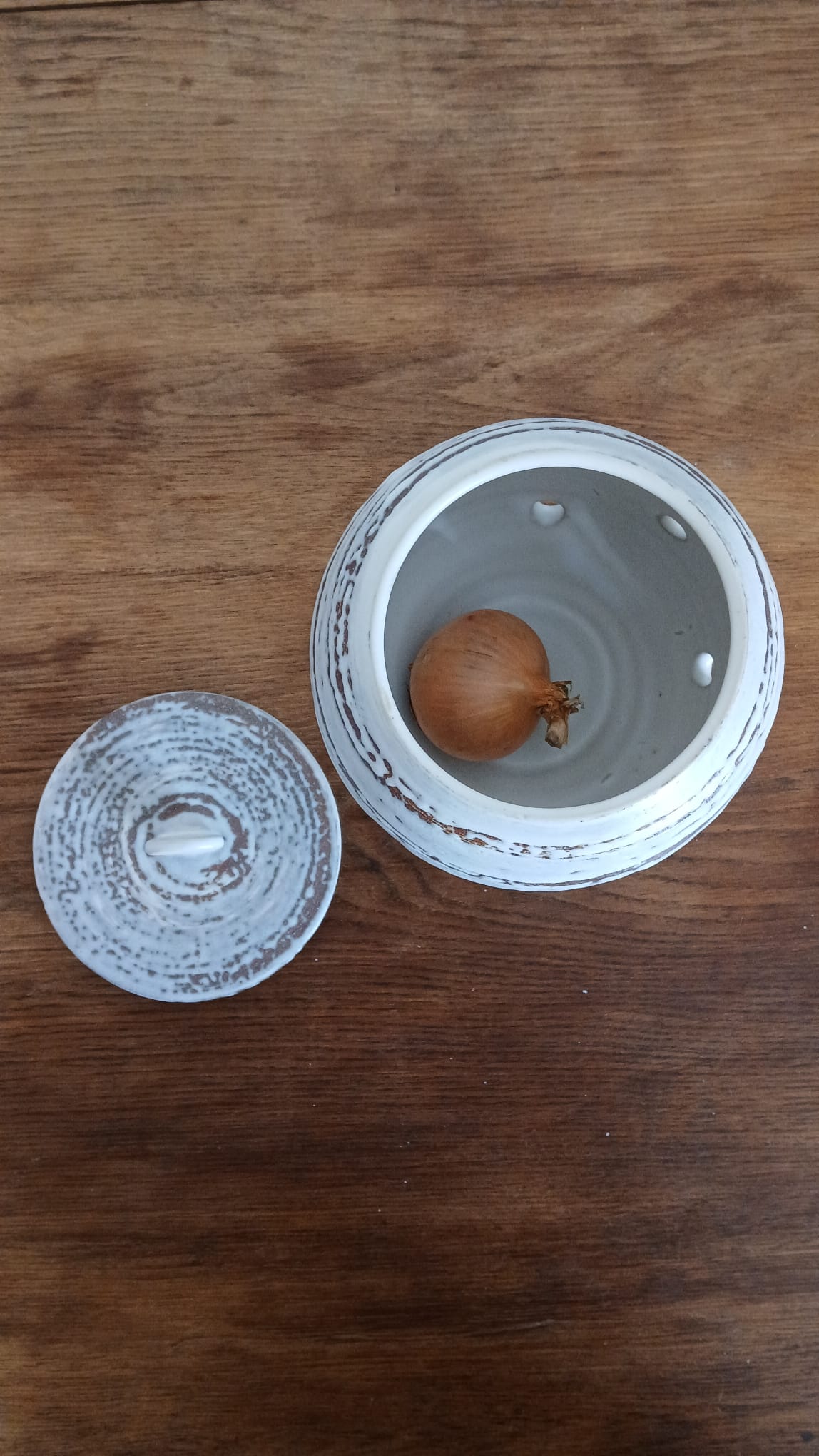Ce pot en céramique est pensé pour conserver naturellement les oignons, l’ail et les échalotes. Son intérieur sombre les protège de la lumière, tandis que de discrètes ouvertures permettent à l’air de circuler. Cette ventilation aide à préserver les bulbes plus longtemps, en évitant l’humidité et en recréant des conditions de conservation idéales.
